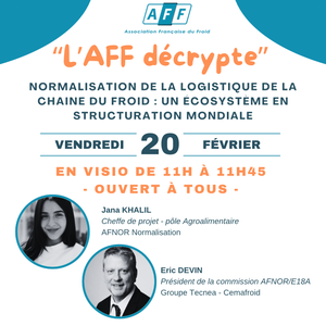L'Association Française du Froid vous invite à son prochain épisode en ligne "AFF décrypte", 100% public, 100% gratuit pour découvrir un sujet d'intérêt général. Le 20 février, nous vous parlerons de la normalisation de la logistique de la chaine du froid !