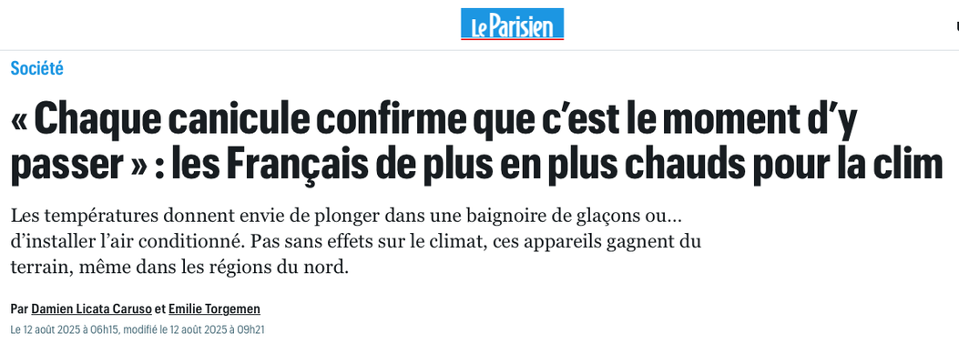 Gérald CAVALIER, président de l'AFF, a été contacté par le journal Le Parisien afin d'apporter quelques éléments de visibilité sur le développement croissant du froid de confort chez les français au titre de l'expertise de l'AFF. L'article est réservé aux abonnés, l'AFF respectueuse des droits, vous transmet cependant le lien d'accès : https://www.leparisien.fr/societe/chaque-canicule-confirme-que-cest-le-moment-dy-passer-les-francais-de-plus-en-plus-chauds-pour-la-clim-12-08-2025-ZFZKHGIAABG5NER654YZXHJJLU.php